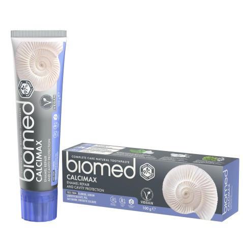 Biomed CALCIMAX întărește pasta de dinți cu sare din marea antică și hidroxiapatită de calciu pentru a proteja împotriva cariilor dentare și pentru a remineraliza eficient smalțul. Dinții puternici formează caracterul!